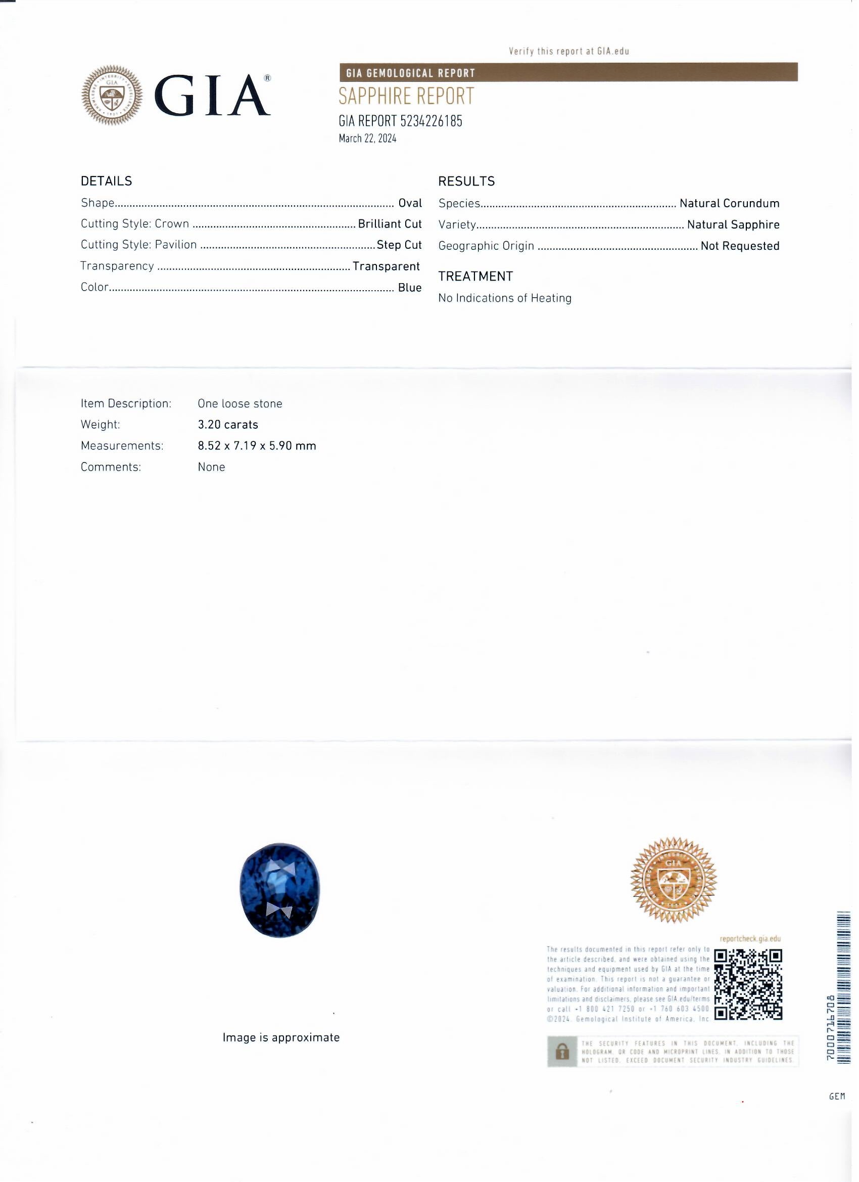 Platinum (PLAT) natural unheated blue sapphire corundum and diamond ring. An oval brilliant cut natural unheated blue sapphire corundum gemstone is mounted in the center of the ring. Round brilliant cut diamonds accent the ring around and on both sides of the center gemstone. The ring has a gross weight of 9.5 Grams. Reference: GIA Sapphire Report 5234226185 #NATURAL GEMSTONE# GEMSTONE: Sapphire Corundum; NATURE: Natural (No Indications of Heating); SHAPE: Oval Brilliant, Faceted Cut; WEIGHT: 3.20 carat total; DIMENSIONS: 8.52 x 7.19 x 5.90mm; CLARITY: Type 3; COLOR: Blue (5/5); SYMMETRY: Excellent; COLOR INTENSITY: Intense; TRANSPARENCY: Transparent; TONE: Dark #NATURAL DIAMOND# SHAPE: Round Brilliant Cut; WEIGHT: 1.15 carat total (52pcs.); DIMENSIONS: 2.6 x 1.6mm; AVERAGE CLARITY: VS1-SI1; AVERAGE COLOR: F-G; SYMMETRY: Excellent; POLISH: Excellent #METAL# METAL: Platinum; PURITY: 950; COLOR: White; CONDITION: Excellent; FINISH: High Polish #Size: 6 3/4